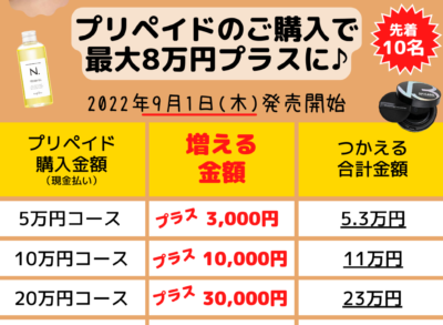 お金の価値を増やせるチャンス 年4回のみの発売です(9月30日まで)先着... 2022.09.09 有限会社lhimpioお知らせ 【美容室QUEST21周年記念】ネット予約のマイコレ会員様限定💖お得なプリペイド購入で最大8万円分プラスで使えます!! 昨今、低金利時代… 『お金の価値を増やそう!』物価上昇で少しでもお得に暮らしたいと誰もが思っていると思います♪美容室QUESTでは... 続きを読む
